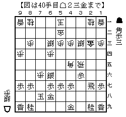 左図の銀取りが痛打でここで▲2四歩の攻めあいは△7六歩から玉頭を抑えて、△3五飛▲2三歩成△2七歩▲同飛△4五角▲3六歩△2三金で右図のような進行が予想される。