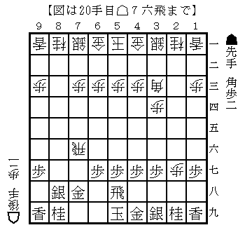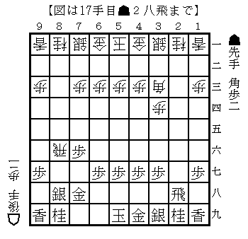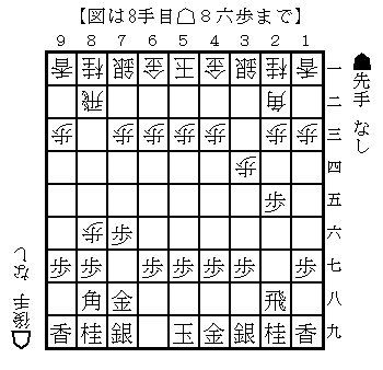 棋譜データベースを調べた結果、一番有効な対策は左上図の▲2八飛である。左上図では28-8と先手が圧倒!先手の狙いは左上図以下△2七歩▲5八飛△7六飛 右上図となり、ここで▲7七歩とするのが大事で△2六飛▲8三角で下図。すぐには無いものの▲7七歩で▲7七銀とすると△7七角成から銀を取られ、△2八銀のカチコミがあり、下図の▲8三角を楽しみに受ける。後手は一歩得だが、角の活用が難しく苦労する展開となる。