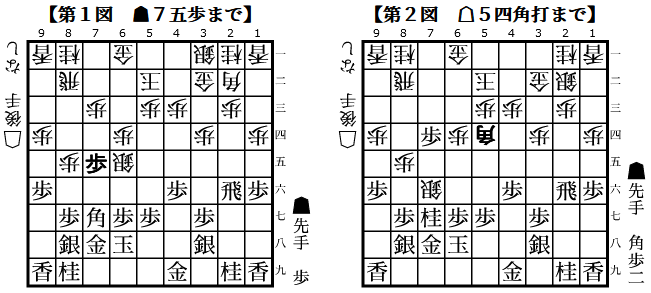 1図の角打ちは攻防の手のようで緩手。△5四歩から▲7四角とすると角が取られる展開となるため▲6六歩と若干良くした。△6七角から△7五歩と攻勢に出たのが失敗で、矢倉のように金銀を固めて囲うのが良かったようだ。2図で角を手放したのは悪手だった。
