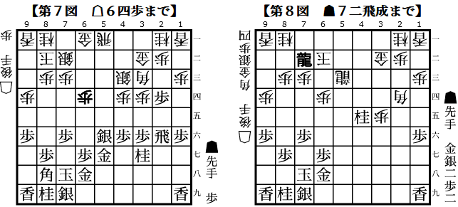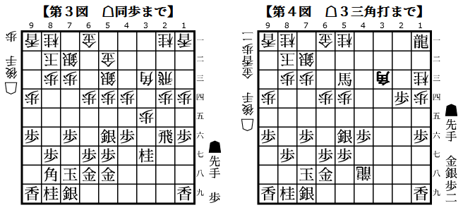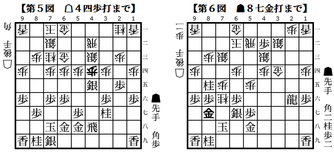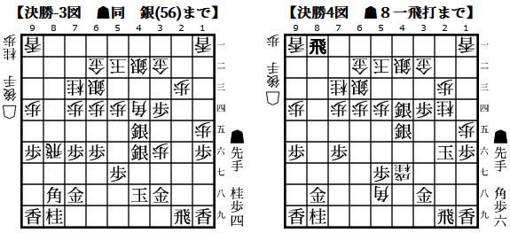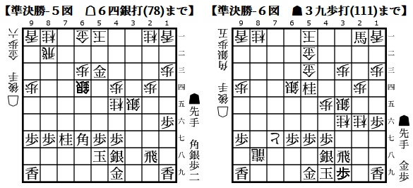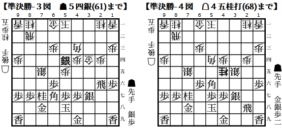3図では65銀から▲5四銀としているが、▲5四銀打とするところでお互い読み抜けか?4図の桂打ちもお互い▲4六銀を軽視しており、形勢がシーソーゲームしてました。