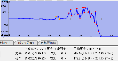◆準決勝は大田さんとの対戦。事前研究で棋風が近そうであると感じていた。対局は私の後手で評価値グラフ、一致率などをみると、お互い悪手が悪手を呼ぶ展開だったようだ。50-80手当たりの差し回しは押されている。対局中は自分では攻めが細いけど戦えていると思っていたが、実際は悪かったようだ。序盤互角、中盤大田さん寄り、終盤えんじゅ寄りと言ったところだろうか。序中盤でポイントを稼げなかったのは反省。