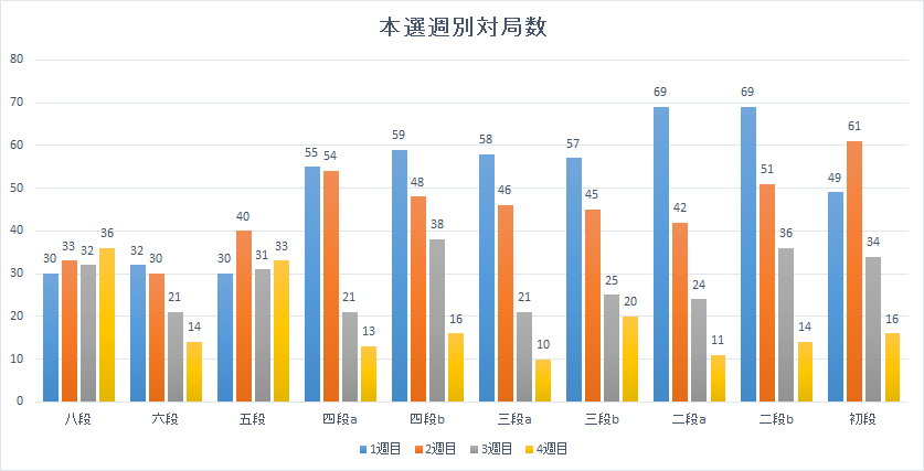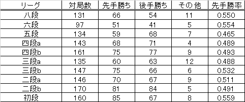 五段から三段にかけて後手勝率がいい。有段者になるためには攻めを覚え、三段で受けを身につけ、六段以上で針の穴を通すような攻めができるようならなければ成らない。本選、予選通して似たような傾向があるように思います。