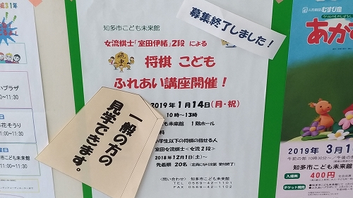2019年1月14日 知多市こども未来館にて、室田伊緒女流二段の将棋こどもふれあい講座が行われた。気づいたときには受講募集は終了していたが、見学自由だったため娘を連れて行って見ました。内容は駒の動かし方がわかるくらいの子が対象のように思った。