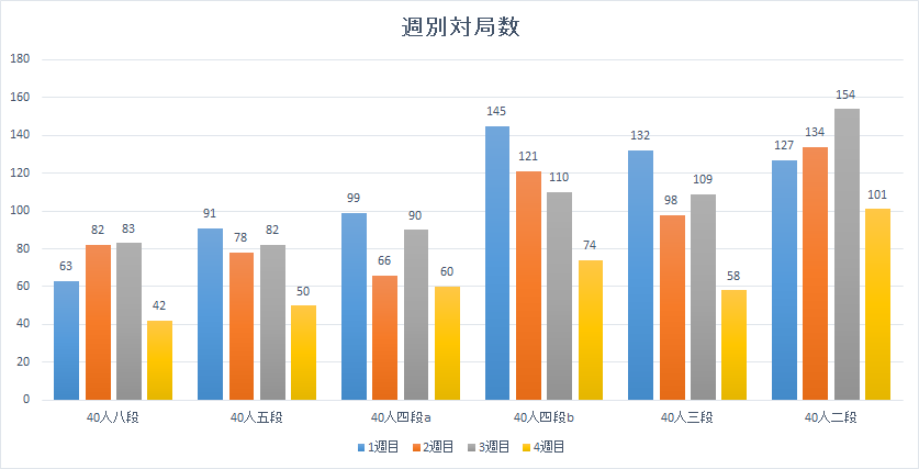 週別対局数を表にしてみました。過去の結果から四段bの進行を予想しており、対局状況からも想定と一致していました。二段は3週目が対局数多いので、進行を見て慌てて対局数を増やしたのかなと想像します。