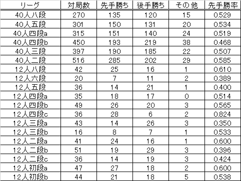 団体戦も終わったので毎年恒例の棋譜収集を開始。とりあえず初段以上の結果は下の表のようになっています。40人リーグ四段b、二段の対局数多くない?予選ボーダーを昨年の結果から45点と想定していましたが、40人四段bでは20位が53点でした。40人二段は20位が56点となっていました。