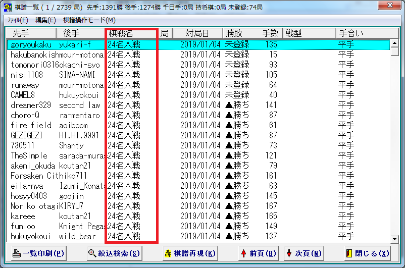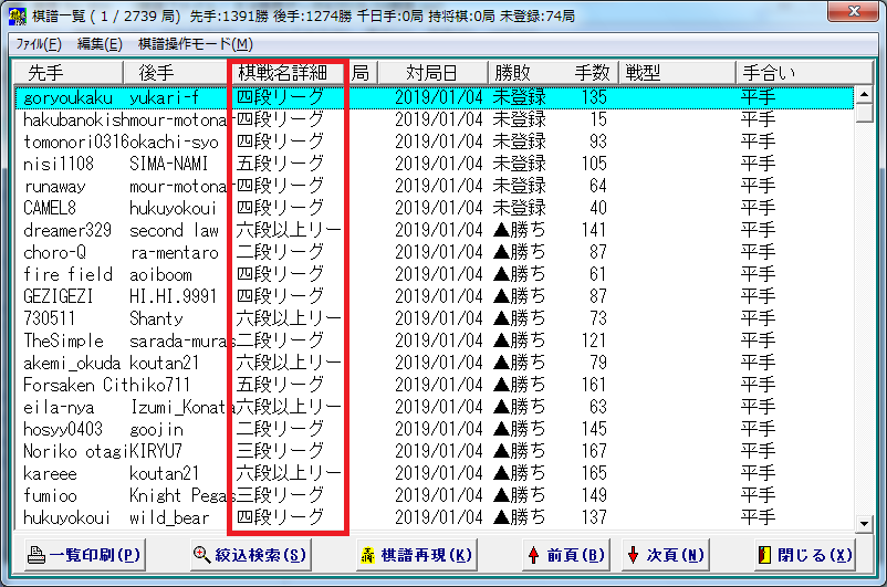 工程(3)棋泉入力のために工程(2)の棋戦名一括変更機能を使って一旦別の棋戦名に変更する。ソフトで「棋戦詳細」をソートすれば同じ情報のものを一まとめに出来ます。例では「順位戦」としました。この工程はリーグごとに分けるために行います。