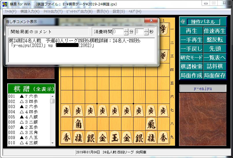 第24期24名人戦予選終了しました。2019年1月4日から1月28日の4週間。私は40人リーグ四段bでの参戦で、14勝14敗となり17位で予選通過となりました。最終日直前で連敗して22位まで順位を落としたときは冷や冷やしましたが最終日3連勝して20位以上、予選通過ラインを突破できました。