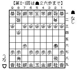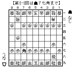 初手▲7六歩に対して△8四歩に対する方針について。 振り飛車党なら3手目は飛車を振れば良いが、 居飛車党で矢倉は指さない党のため、3手目は▲2六歩(第2-1図)としている。第2-1図 から想定される戦型は角換わりと横歩取り。 第2-1図 から △8五歩▲7七角(第2-2図)となれば角換わりが濃厚。