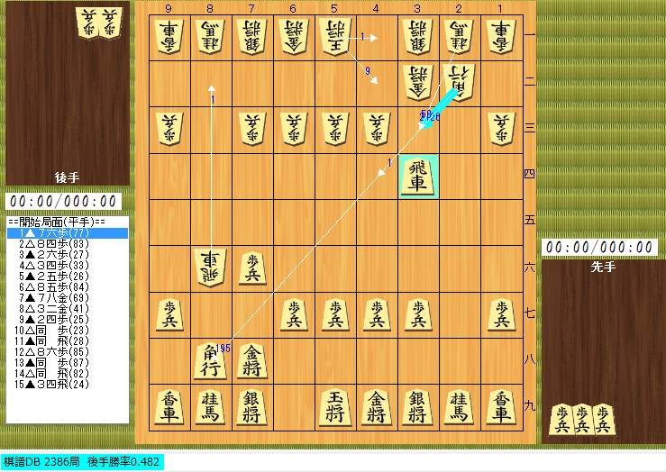 第2-2図からは後手の戦法はかなり限定される。直下の画像は2015年以降の将棋倶楽部24高段者棋譜集より解析した採用率である。 第2-2図 以下は△3四歩となることが多い。数は少ないものの△8四飛もあり、狙いは第2-5図の縦歩取り。頭の片隅に入れておいた方が良いだろう。