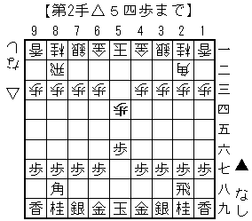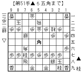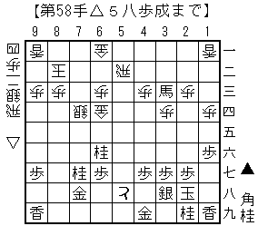 第53手図。馬を作る手だけど後手の6四歩を突かせているのが効果的。相手には端攻めも見えているだけに嫌味だろうと思う。実感としては、やや不利だと思う。