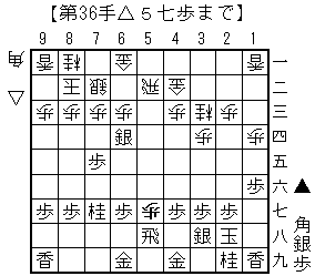 お互い駒組みが進んで第36手でいきなり決戦。端の交換がある分△6四歩でも十分と思ったが△5七歩としてみた。