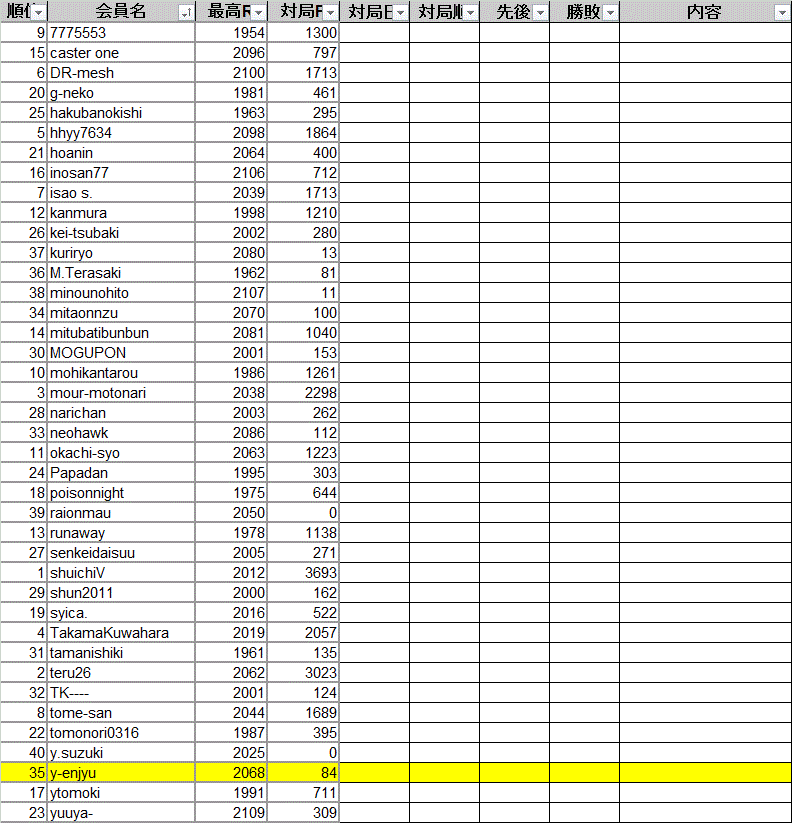 将棋倶楽部24の恒例行事、第24期24名人戦が開幕します。今回は863名の参加となり、ついに参加者は1000人を切った。予選は1/4から1/27までとなる。自分は予選四段b40人リーグとなりました。経験上四段リーグは厳しいので勝ちあがれるのか大変不安。下の表は、毎年作成している対局チェックシート。