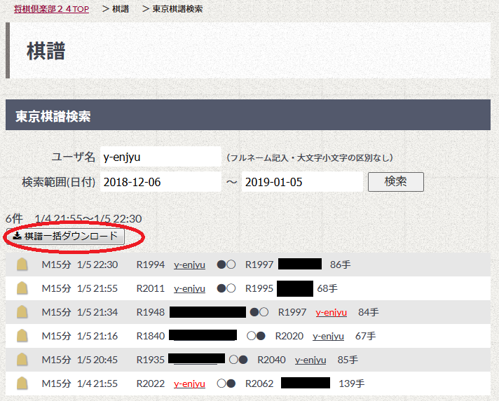 この棋譜一括ダウンロードは将棋倶楽部24のID所持者のみとなっているようです。利用方法は 下の3つの工程のみ。あとは、下の画像にある棋譜一括ダウンロードを押せばOKです。