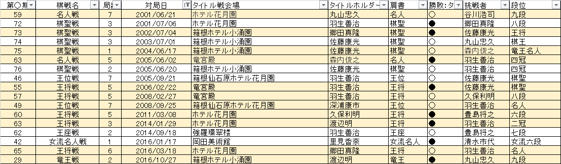 11月の連休中に箱根に行こうと思うので、箱根のタイトル戦をピックアップしてみた。毎年年末更新してるので2017年分はないです。