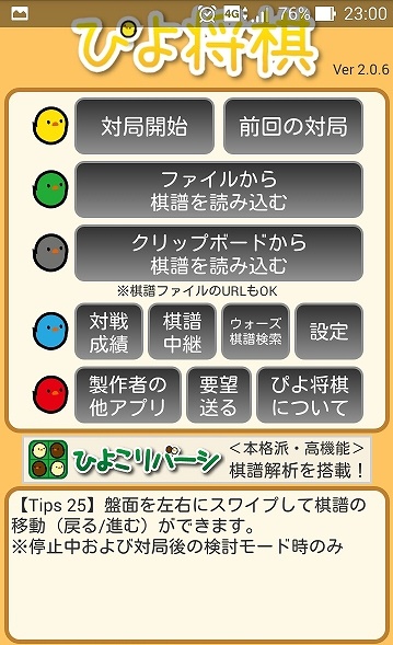 最近多用しているAndroidアプリ「ぴよ将棋」。以前の認識は対局と棋譜検討用アプリと思っていたが、将棋ウォーズで指した棋譜を呼び出す機能があり重宝している。棋譜自体はパソコンで定期的にダウンロードしているのだが、ワンクッションあり対局直後に検討したいときは手間が多かったのが、「ぴよ将棋」なら手軽にできる。またCPU棋譜検討で形勢判断できるのも良い。