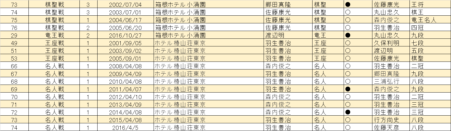 mixiニュースをみていたら「箱根ホテル小涌園(こわきえん)」が営業を2018年1月10日で終了とのこと。タイトル戦の宿として利用されていたなと思い表にしてみました。記事を読んでみると藤田観光(東証1部9722)経営のホテルのようで、株主優待情報を見ていたらここ数年名人戦を誘致している「ホテル椿山荘(ちんざんそう)東京」も営業しているようだ。