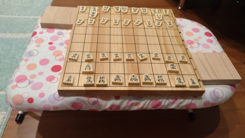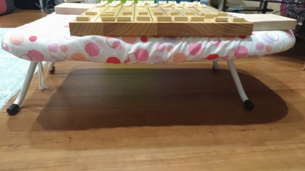 将棋盤の置き方も工夫、専用机を買おうかと思ったけど、アイロン台がちょうどよかった!