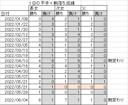 通っている「おおぶ将棋クラブ」で長女と次女が12級から11級へ昇級しました。長女は5/21に続いての昇級。「昇級したら服を買ってあげる」効果なのだろうか?長女は直近の成績から勢いで昇級するかもしれないと思っていたが、次女は予想外でした。ただハンデの大きい相手が多かったから、もっと級位の近い人と戦ってほしい。
