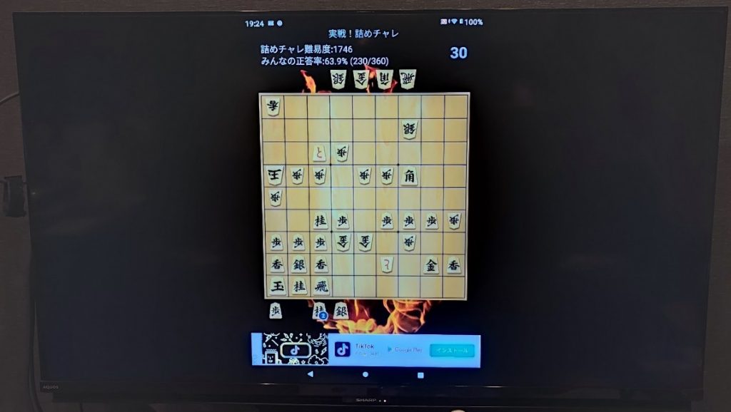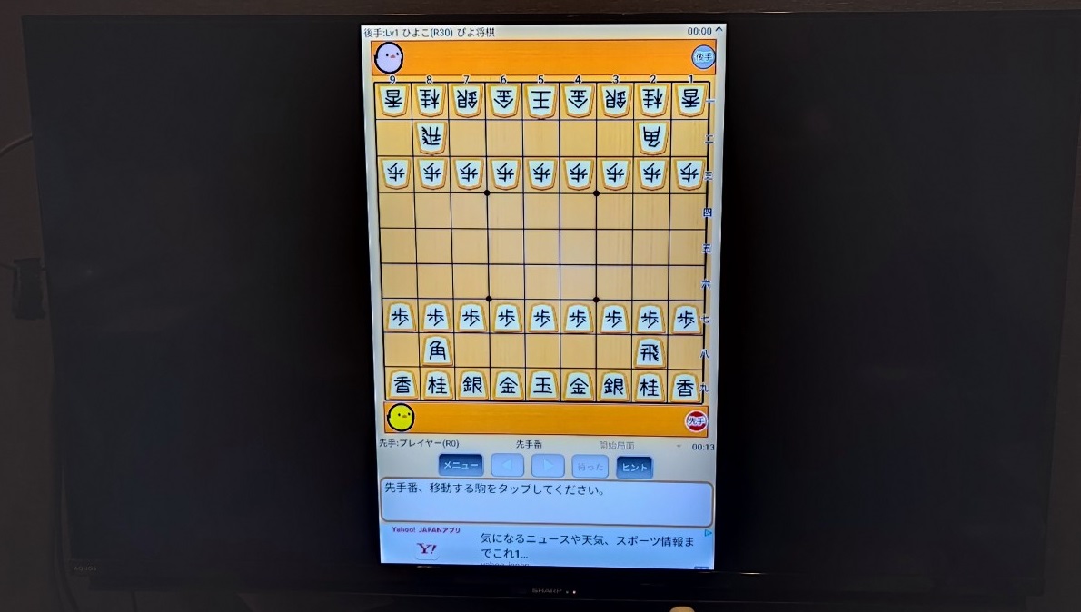 キャストをすると横長のTV画面にスマホの縦長画面は相性が悪く見栄えが悪かった。このタブレット縦横比が程よくて、「将棋クエスト」と「ぴよ将棋」をキャストすると下のようになりました。比較元を