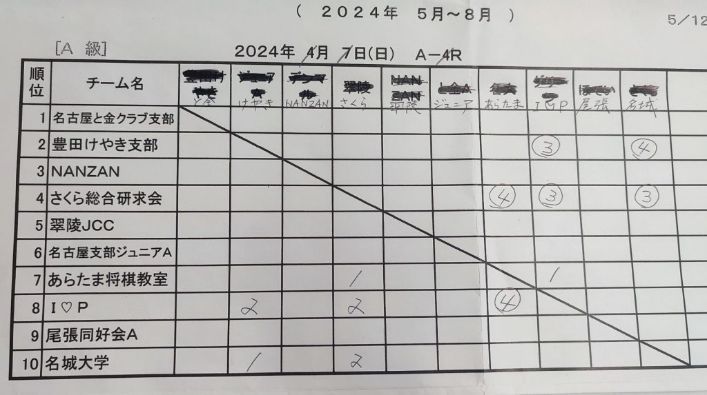 ※リーグ表を撮影したときは、あらたま将棋教室-名城大学戦が終わっていなかった。