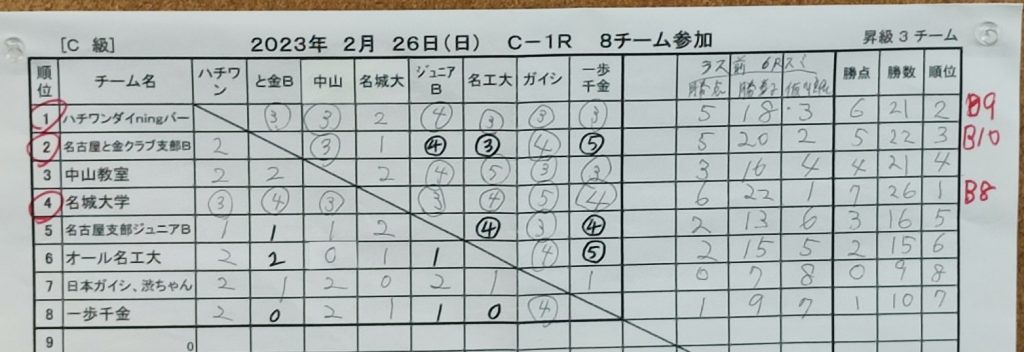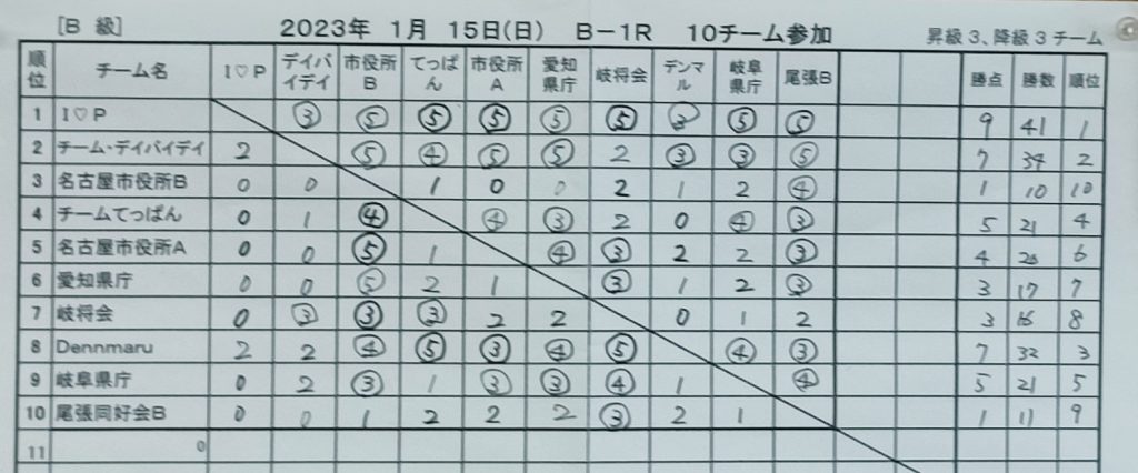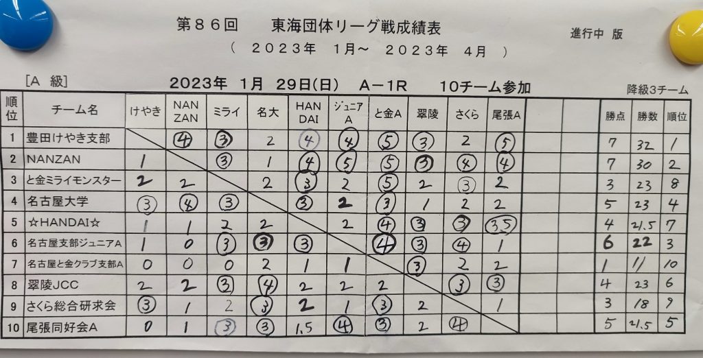 2023年4月16日、第86回東海団体リーグ最終戦だった。ここまでチーム3-3の暫定6位。7,8,9位との直接対戦を1勝できれば残留かと考えていたが、結果は全敗で降級となりました。8回戦の☆HANDAI☆に勝っていれば残留だったかもしれない。
