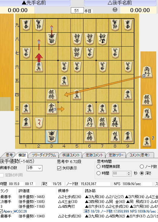 ●下図で▲35歩が第1候補なのに驚く。棋譜並べの際は「居飛車の棒銀が使いにくくなるから緩手」と言ったのだが・・・。△43銀に▲15銀が継続手のようだ。端歩を突いていないのは気になったのだが、端歩ありだと候補も変わるかな?