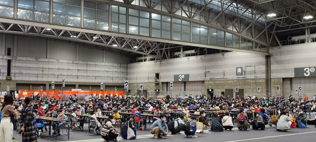 大会案内には10時から大会開始で9時から自由対局とあったけど、結局自由対局はなかった・・・。自由対局のために9時前に会場に到着していたのに残念。並んでいると長女のクラスメイトSくんが目の前に、通っている将棋クラブのRちゃんが真後ろに並んでおり驚いた。数百人いるなかで偶然過ぎる。