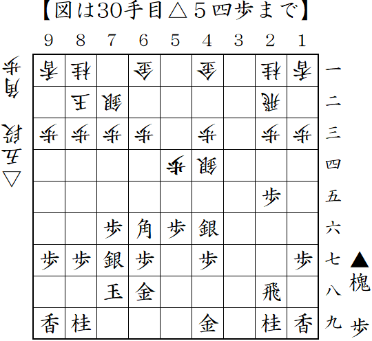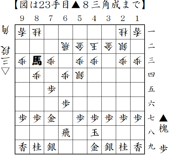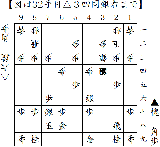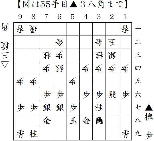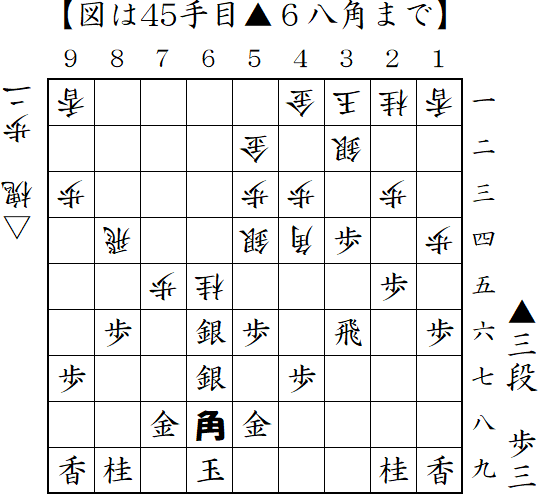 角換わりに変則的な中住まい。自陣角を打ったところ。桂馬頭を狙われるとやばかったので▲4七角だったか?中盤は苦しくなったが、終盤でまくって勝ち。