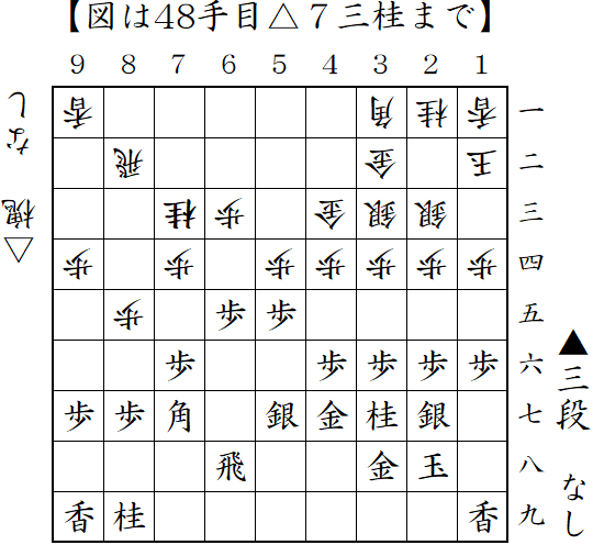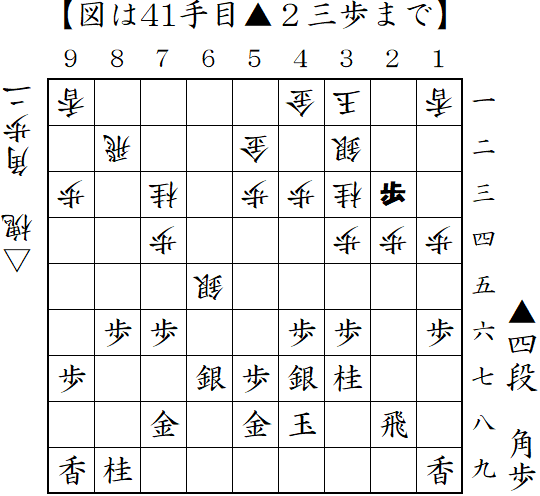 △2三歩戦法から持久戦へ。先手は手待ちを繰り返す。ソフト的には△2六飛や△9五歩から1歩入手して△3六歩でしたが、△3三桂-△5六銀と盛り上がり、じわじわ制圧して勝ちになりました。