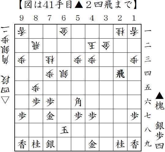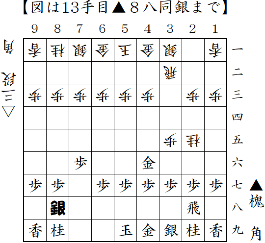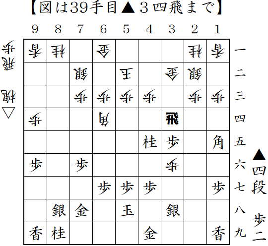 雁木に対して左美濃急戦。戦いはこれからってところで、うっかり△8六飛・・・。ただで上げてしまった。ここでは△4五銀から△8八歩とするのが良かった。