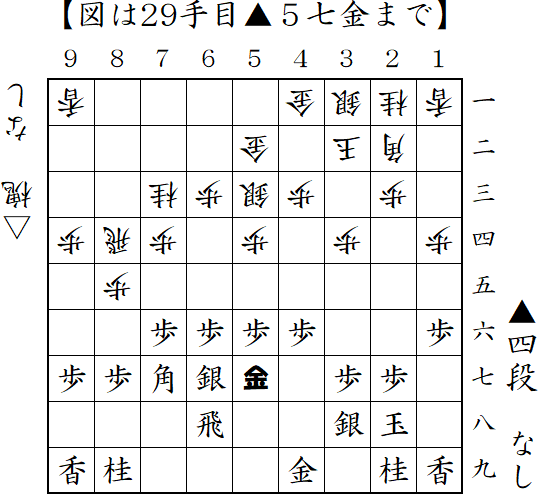 金無双急戦を見せたところ早々の▲5七金。構わず金無双に組んでから穴熊にしたけど、後で振り返って考えてみたら単純に天守閣美濃組めばいいんじゃね?結果は勝ったけど、次は左美濃やってみる。