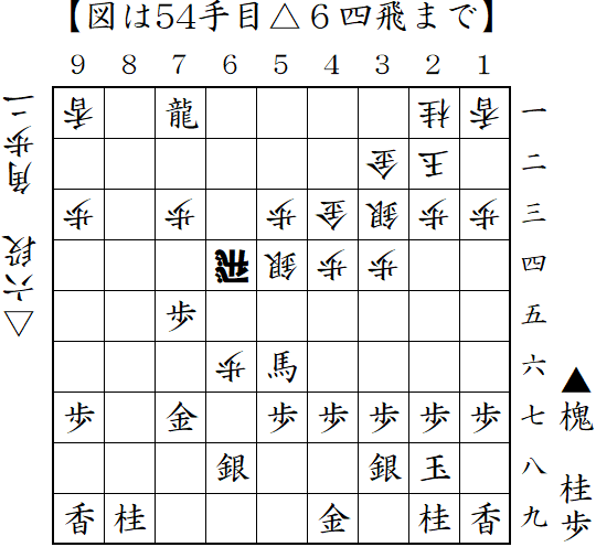 序盤早々に馬を作ることに成功ししかも駒得。感触悪くても第一感の▲7六桂から飛車を取りに行くべきだった。本譜はここから▲7三龍として遅い攻めとなって玉頭から反撃されて負け。
