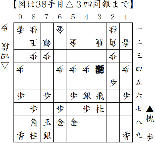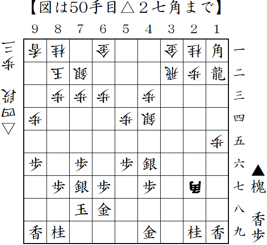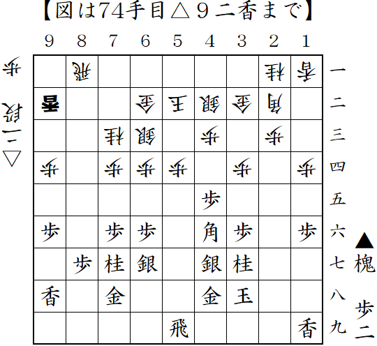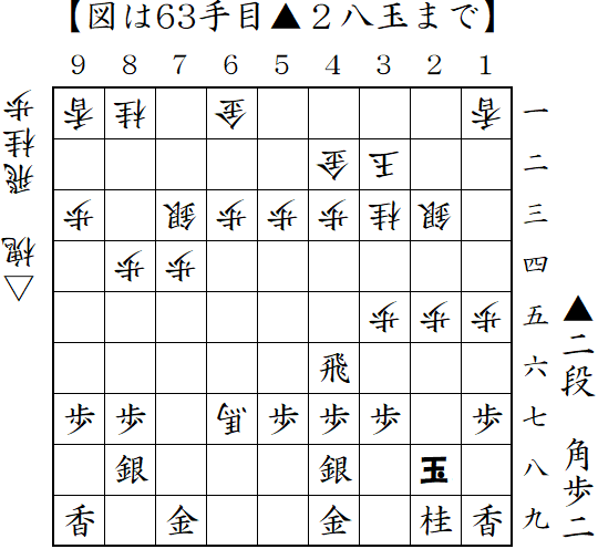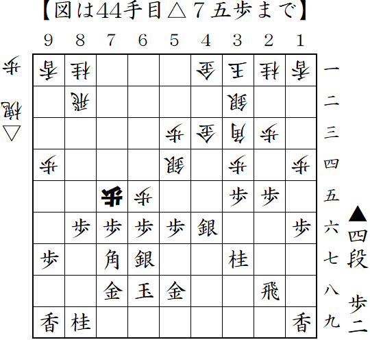 相掛かりから先手は2八飛と低く構える形。浮き飛車で対抗していたが、棒銀の直撃を受けて反撃したところ。▲7七玉の顔面ブロックや▲2二歩成-▲2四歩からの攻め合いなら先手が良かったようだが、▲7五歩が攻めを呼び込み一気に畳みかけ勝ち。