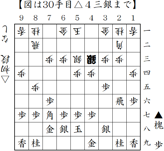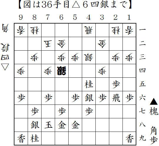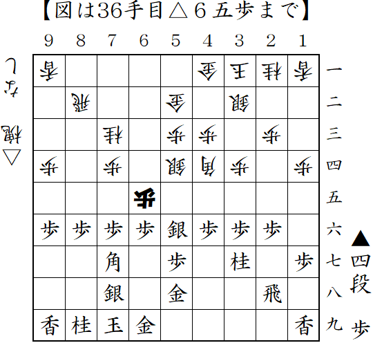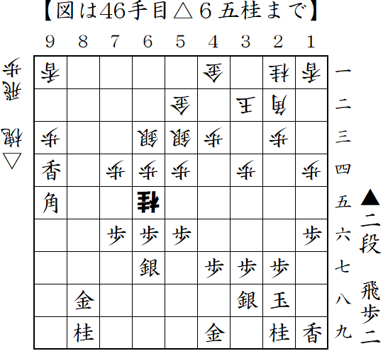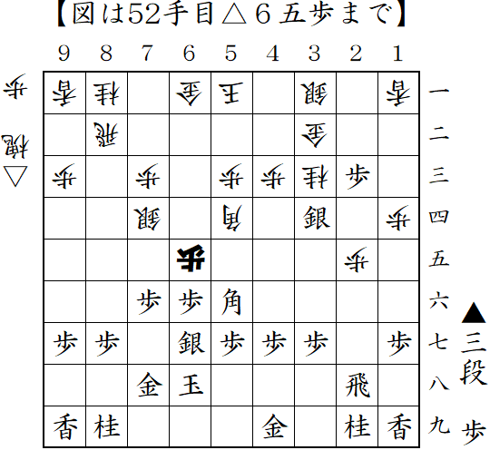 向飛車に居飛車急戦で対抗。仕掛ける前に端から仕掛けられるが、図の△6五桂が読みぬけだったのか振り飛車側が駒損の攻めとなった。