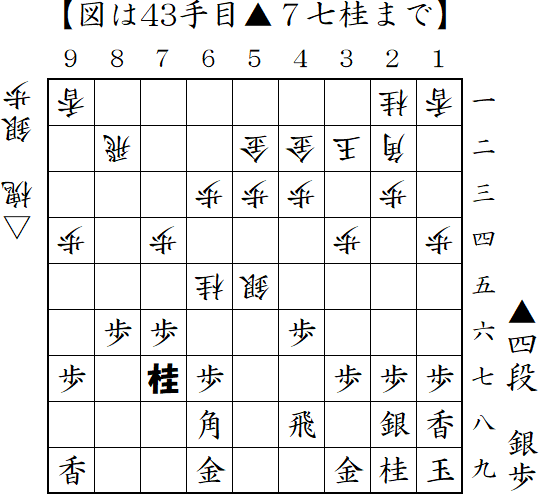 今までここで△3三桂としていたけど△4四歩や△3三金で後手の形勢がいいらしい。次は△3三金を指してみようと思う。