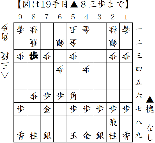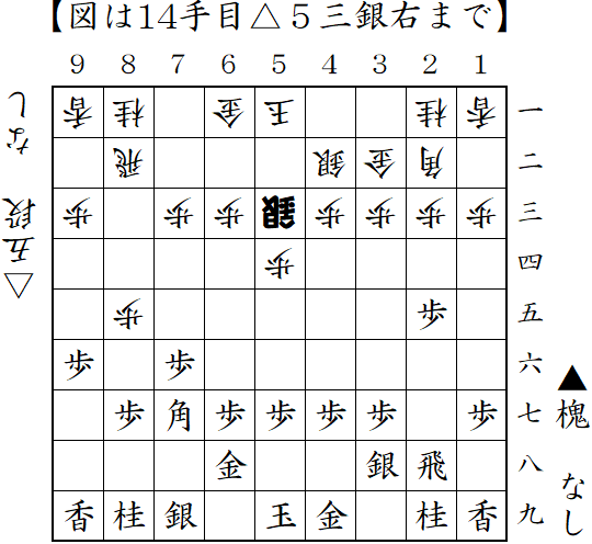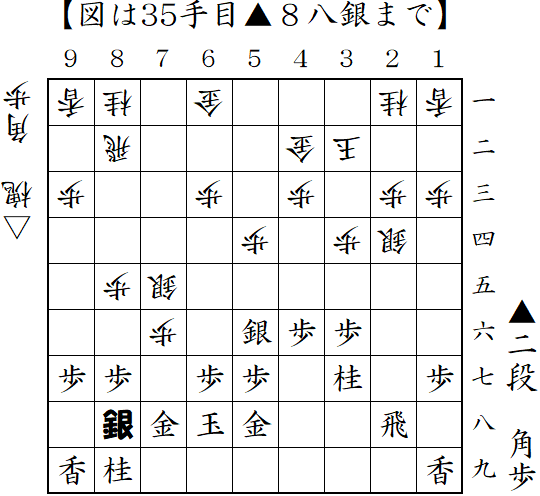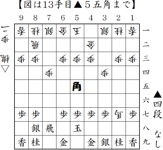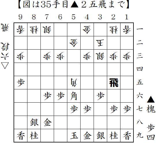 3手目▲6八金からの筋違い角。△5五角に対して反撃の▲2五飛。これで形勢優勢だったようだが、決めそこない結果は負け。