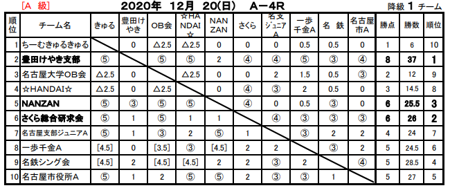 2020年12月20日の第81回東海団体リーグの結果