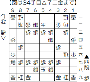 △3三金ではなく角交換▲7七金戦法。速攻で仕掛ける。5六の角が強力で一方的にタコ殴り勝ち。
