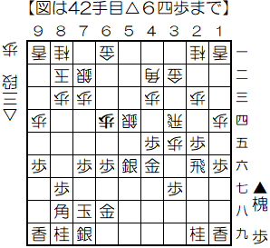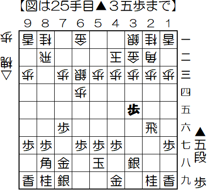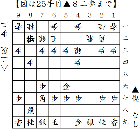 角換わりになるかと思ったら飛車先を交換させてくれた。狙いは図からの銀冠。2四の歩を取れば△3五角の反撃があるため取れない。飛車先の歩は▲4八銀を入れてからするべきだったか?