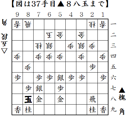 相筋違い角の将棋となり図の局面。銀が進出しているだけいいのかなと思うけどあとでソフト検討してみよう。角をいいタイミングで銀と交換したかったけど、タイミングを逃して角交換となる。お互い居玉で意地を見せ最後は勝ち。