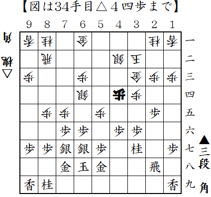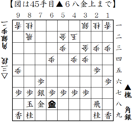 角交換△3三金。普通に腰掛銀で4筋狙われるときつい。図の局面で▲5四角なら投了レベルだったけど見逃してくれたので、いい勝負となったが、最後は時間切れで負けました。