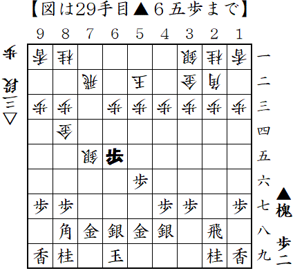 初手から▲7六歩△7四歩からの袖飛車。右金も繰り出して景気がいいね~。挑発返しで▲6五歩。△7四金なら▲5五角△7三桂▲2四歩の十字飛車狙い。6筋のこびんを狙って中押し勝ち。
