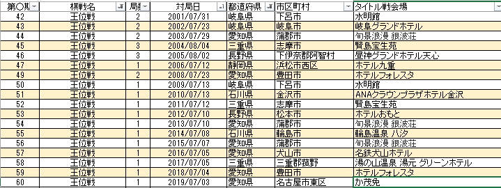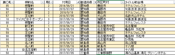 21世紀からのデータだがタイトル戦の宿をエクセルに入力している。直近5年の愛知、岐阜、三重のタイトル戦を抜き出して見ました。