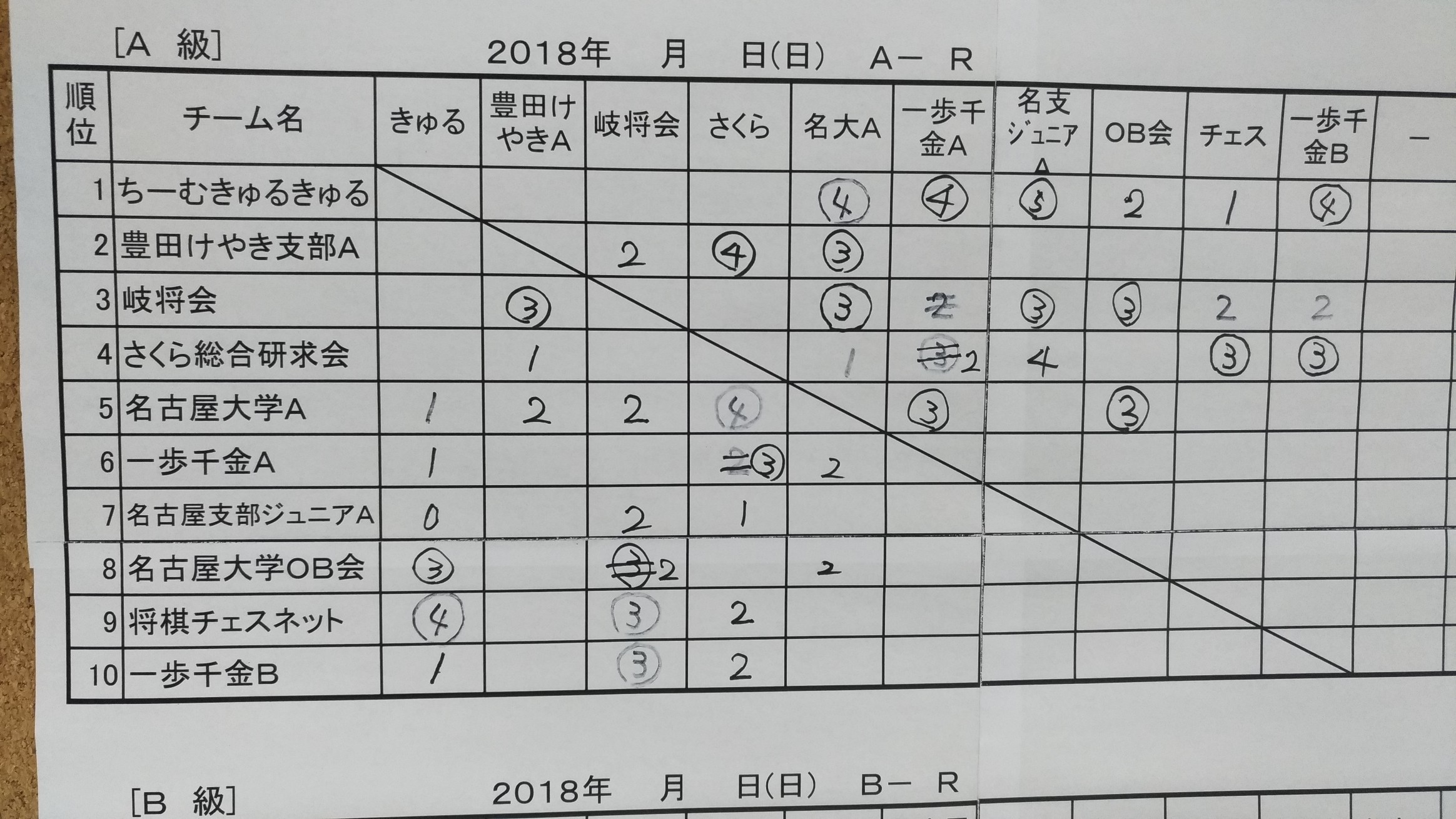 2018年7月8日の団体戦2日目は会長含め9名が参加。一歩千金A戦ではオーダーが読みとかみ合わず落としたものの2戦目では4-1と勝ち。3戦目は何とか全敗を免れた。