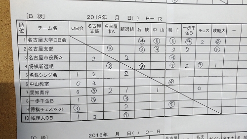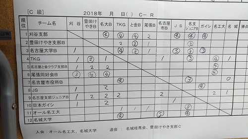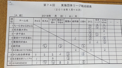 2018年2月25日の第74回東海団体リーグA級2回戦は結果は次のようになりました。対名古屋と金クラブ支部Aは人数が4人だったが5-0と幸先良いスタート。対名古屋大学Aはレギュラーメンバーでないと聞いていたが勝ちきれず2-3。最後の豊田けやき支部Aも同じく2-3でした。今期ここまでチーム2-4と負け越しているがチーム負けでも2-3と勝ち点を多く取っており同率となった場合、有利に働くと思う。最終戦は降級直接対決もあるので残留には2勝が必要だ!