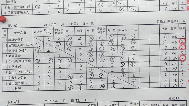 2017年12月24日の第73回東海団体リーグ最終日でした。ここまでチーム5勝1敗で3位。1位の将棋新選組とは対戦を終えていたため、将棋新選組の結果次第で優勝が狙える状況であった。1,2,4位の上位陣のつぶし合いがあり、最終☆HANDAI☆戦が優勝決定戦となった。勝てば優勝、負ければ3位の決戦は3-2で勝ち切り優勝することができました。久々のA級復帰となります。
