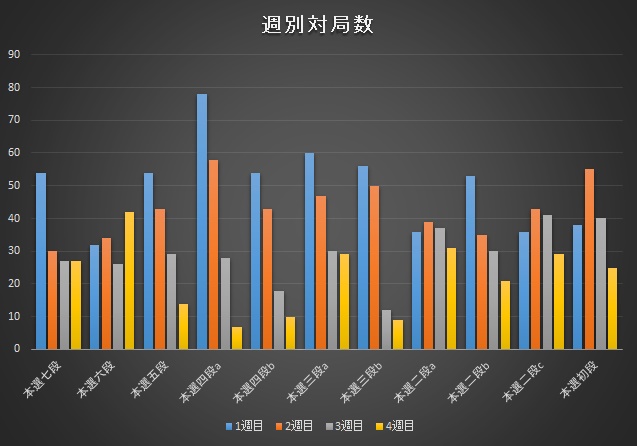 六段と七段は後手勝率が高いのは予選に引き続いている。週別を見ると五段?三段が序盤に対局数を伸ばし、六段、七段は横ばいである。六段、七段ではペース配分を考えてじっくり指すタイプが多いということだろうか?