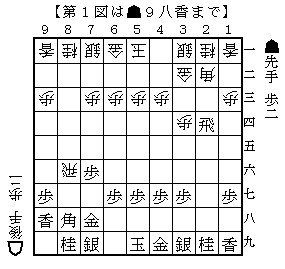 将棋ウォーズの実戦から。自分の後手番で第1図の▲9八香!3分切れ負け将棋なのに一瞬固まるも、経験のある形なので、先手番で第2図の△4五角戦法を狙っている。通常の横歩取り△4五角戦法では飛香取りの角があるのだが、事前に香車を逃げているのが主張である。その変化をわかったうえで香車を取りに行かない「横歩取り △4五角戦法対策」に誘導して実戦は圧勝した。