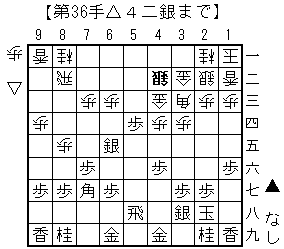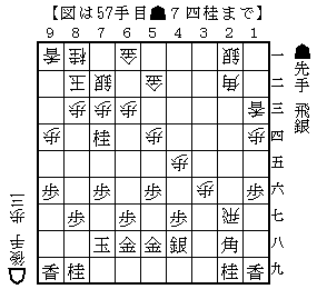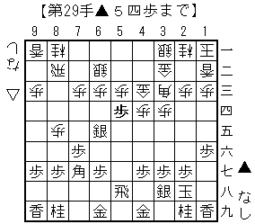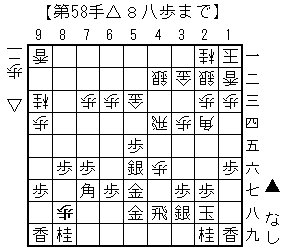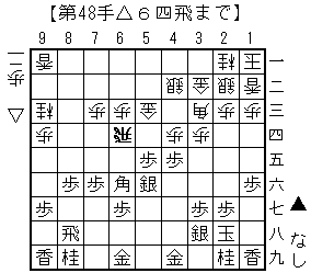 ▲5四歩から△同飛▲5五銀△8九歩成▲5四銀△同金の2枚となり押し切った。