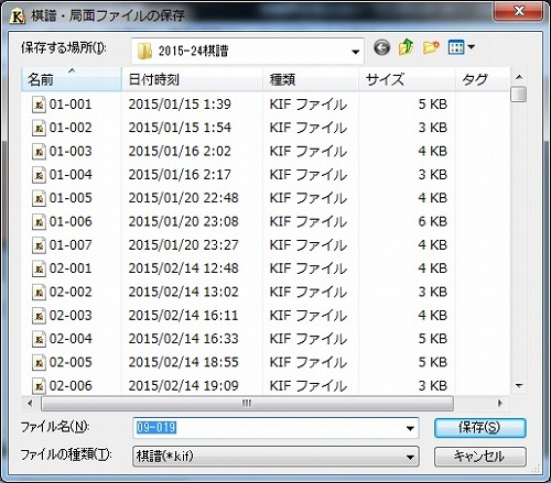 右下図:棋譜の保存。後々を考えてファイル名を付けて保存する。私の場合年単位のフォルダを作成しその中に、9月の1局目は最初の2桁に月を、その後の3桁に月の対局順にナンバリングしており、「09-001」のように命名している。月に100局は指さないのでしたら「09-01」でもいいかも。